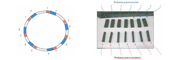Los parámetros utilizados en las soldaduras son los indicados en la figura inicial. A continuación se extraen las probetas indicadas en el siguiente esquema, longitudinalmente y equidistantes.