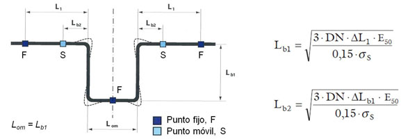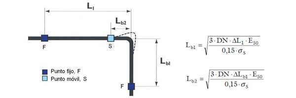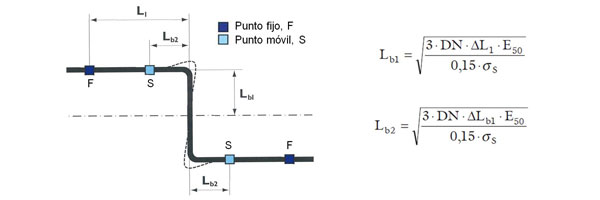 Consiste en disponer en la tubería un quiebro de 90º. La tubería debe quedar completamente anclada a dos puntos fijos y unida por una tercera abrazadera que permita los desplazamientos axiales (punto móvil), de manera que por efecto de las diferencias de temperatura pueda moverse libremente como esquemáticamente se representa en la figura. Supuesta conocida la ubicación de uno de los puntos fijos, la localización del otro punto fijo y del punto móvil Lb1 y Lb2 (en mm) debe calcularse conforme a las expresiones indicadas.
