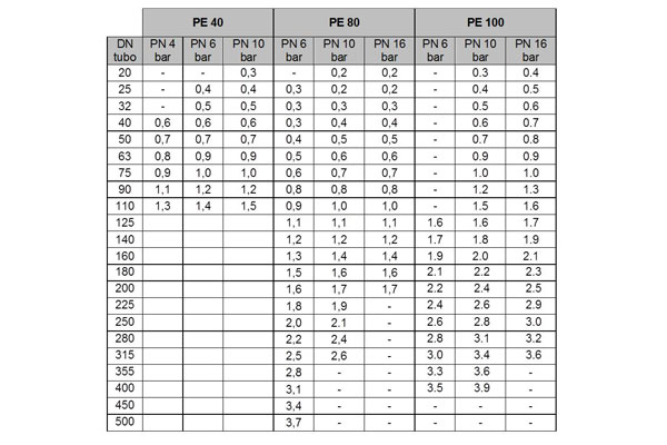 Cuando las tuberías de PE se instalen a la intemperie en tramos rectos y entre apoyos, las distancias recomendadas entre ellos son las que se indican en la tabla siguiente: