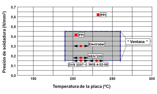 Las investigaciones internas de Hoechst, confirmaron que no se producía ningún efecto negativo en el comportamiento a largo plazo de las uniones de PE con placas calefactoras que estaban entre 190 °C y 260 °C de temperatura. La variación de la presión entre 0.15 N/mm² y 0.45 N/mm² también daba buenos resultados. Basándose en estos resultados se estableció una “ventana” para estos dos parámetros de soldadura a tope.