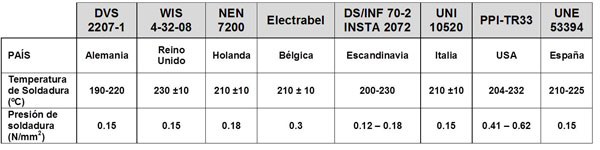 49BEn base a esta “ventana”, distintos países adoptaron los parámetros definitivos de presión y temperatura de la placa para realizar las soldaduras a tope, incluyéndolos en las normas indicadas a continuación.