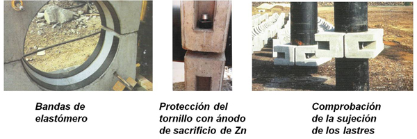 El cemento utilizado en el hormigón deberá resistir a la agresividad química del agua y el acero empleado deberá estar recubierto con un mínimo de 40 mm. La superficie de contacto de los lastres con los tubos deberá estar revestida con bandas de elastómero en EPDM o Neopreno de 5 á 10 mm de espesor como mínimo.