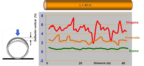 Moderada compactación: Compactación por encima del 87% del Proctor normal. La deflexión ya es más regular a lo largo del tubo.