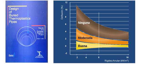 Este estudio ha servido para incluir los resultados en la norma de tubos estructurados para saneamiento UNE-EN 13476. La deflexión media inmediatamente después de la instalación está representada por el borde inferior de cada área y el valor máximo por el borde superior del gráfico siguiente:
