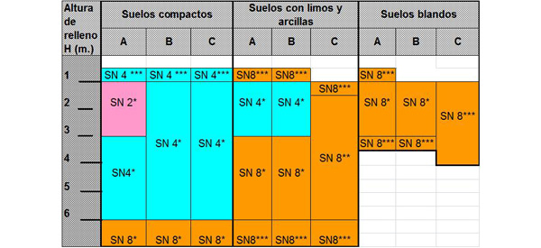En general, para tubos plásticos de saneamiento a usar en Redes de Saneamiento, podemos elegir la clase de Rigidez Anular (SN) en función de la profundidad de enterramiento (H), del tipo de terreno y de las cargas móviles de acuerdo con la tabla siguiente: