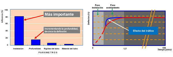 La deflexión de un tubo flexible es controlada por el asentamiento del suelo. Después del asentamiento las cargas de tráfico o del terreno, no afectan a la deformación del tubo. Cuando un tubo es más rígido que el suelo, las cargas por tráfico o de otro tipo, las ha de resistir el mismo tubo.
