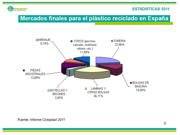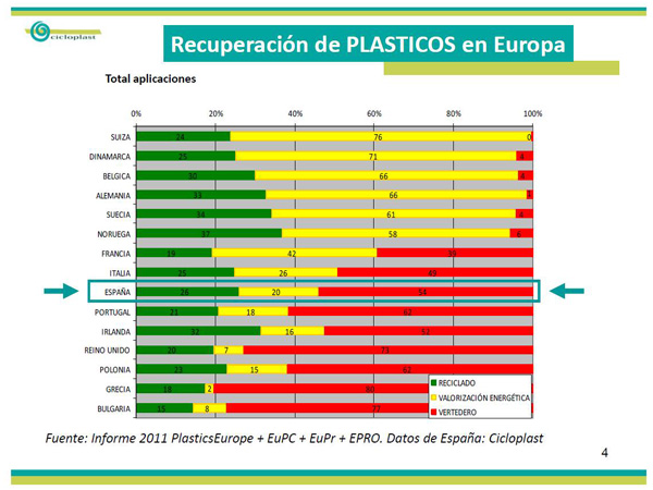 En 2011, se reciclaron en España 565.600 toneladas de plástico, un 9.2 % más que el año anterior.