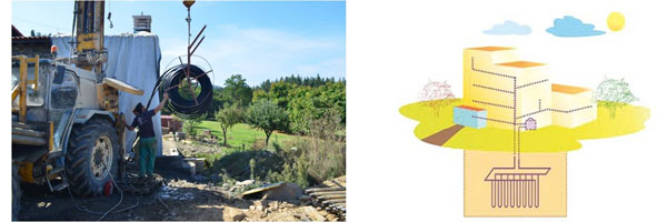 A través de una perforación practicada en el terreno, de entre 70 y 150 metros, se introduce una sonda geotérmica de captación formada, generalmente, por una tubería de PE100. Por medio de la recirculación del fluido caloportador (agua y anticongelante) se absorbe el calor del terreno. En las Instalaciones de los edificios se denomina caloportador al fluido que transporta, por conducciones, calor de un lugar a otro.