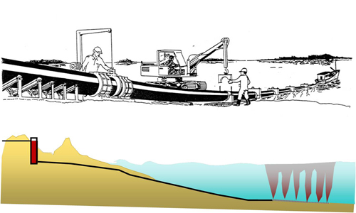 Normalmente se ha utilizado la técnica de construcción de tramos largos en la orilla por soldadura a tope, transportándolos por superficie (flotando) y su hundimiento controlado en forma de una “S”.