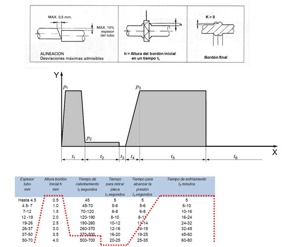 Los parámetros a utilizar, presión, temperatura y tiempo, vienen indicados en las tablas de cada máquina de soldar que contempla las dimensiones, presiones y SDR de los tubos de PE que vienen en la norma UNE-EN 12201. Además se deberá tener en cuenta la alineación, la altura h y que en el bordón final sea K > 0.