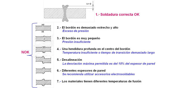 De acuerdo con estos criterios, si la soldadura obtenida no es admisible (NOK), se debe cortar y volver a soldar, aunque si se siguen las condiciones indicadas, no habrá problema y obtendremos una soldadura a tope tan resistente o más que el propio tubo.