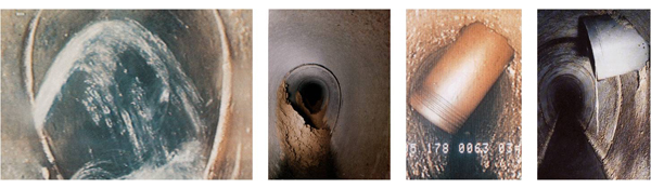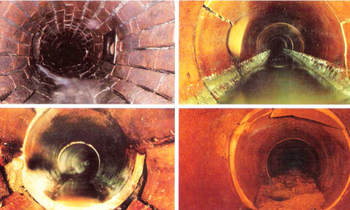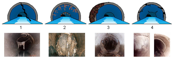4.- Tubos con roturas. Con las inspecciones de los colectores por robots con cámara de TV se pueden ver las roturas. Estas roturas pueden ser debidas a que los tubos rígidos no se pueden deformar, como los tubos plásticos, por lo que están condenados a soportar la carga del material de relleno y las sobrecargas del tráfico hasta que no resisten más y rompen.