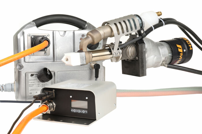 También construimos extrusoras para uso en brazos robóticos. Con un motor sin escobillas y un calentador de aire externo puede trabajar rápido y casi sin desgaste. Disponible como extrusora de varilla o granulado.
