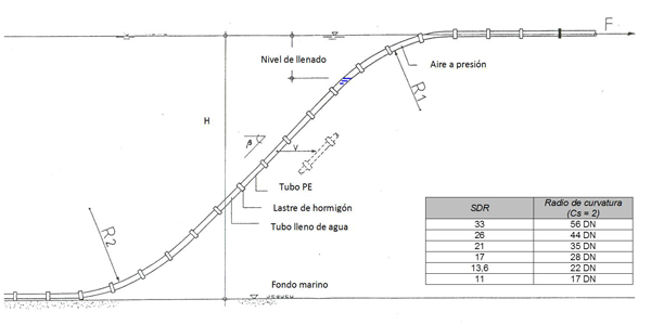 Aplicando una fuerza axial en la extremidad del tramo de tubería flotante, se puede suavizar la forma de “S” del tramo y así disminuir los esfuerzos actuantes, controlando la operación. La fuerza axial aplicada en la extremidad del tubo reduce el radio de curvatura de la tubería. Normalmente la curvatura del tubo es más crítica en la superficie del agua (R1) que en el fondo (R2).