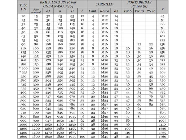 A cada diámetro nominal (DN) del tubo de PE le corresponde una brida, la cual se define por su paso nominal, diámetro entre agujeros (K) y nº de agujeros (ver la primera tabla). Por tanto la otra brida, válvula o accesorio a conectar deberán tener el mismo paso nominal, diámetro entre agujeros (K) y nº de agujeros que la brida loca o sino, se deberán incluir los accesorios de reducción/ampliación necesarios.