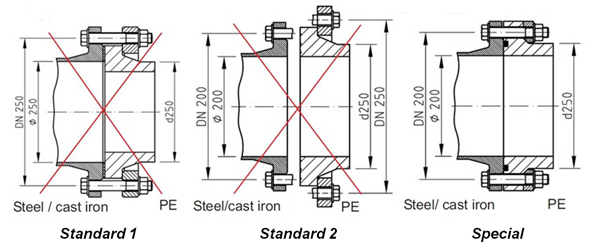 Aplicando una unión de bridas Standard 1, habrá una descolocación interna no deseada (ver el dibujo de la izquierda). Una razón por la que esto pasa es el gran espesor de las paredes de tubos de PE y la estandarización de los tubos de plástico de acuerdo con el diámetro exterior y no con el diámetro interior como pasa con otros materiales. Este efecto de descolocación no se suele detectar a la hora de la instalación y genera problemas en el futuro.